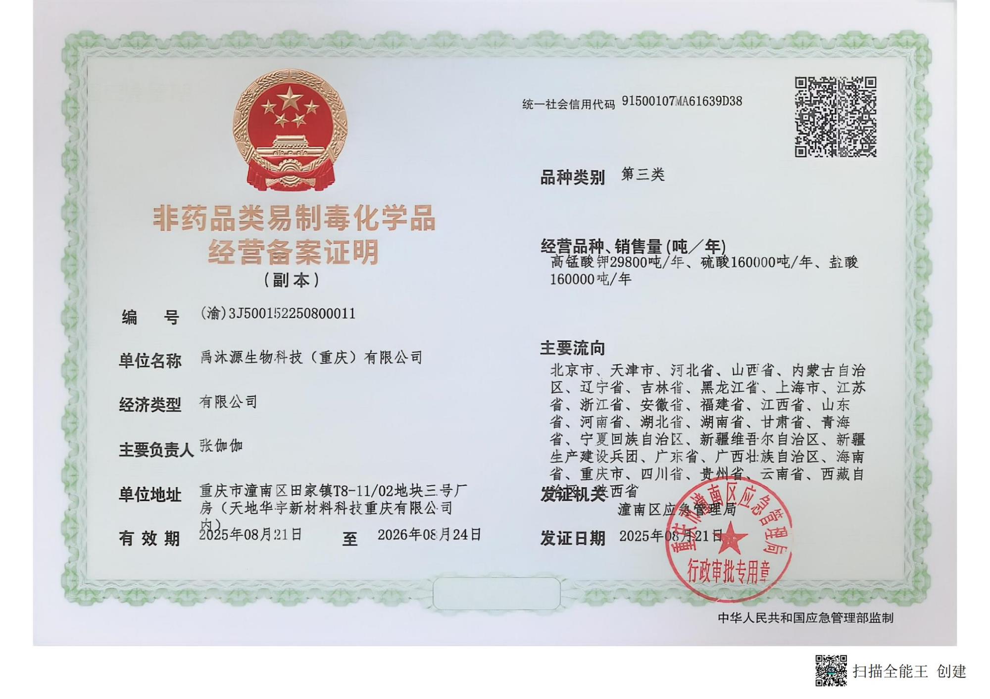 非药品类易制毒化学品经营备案证明